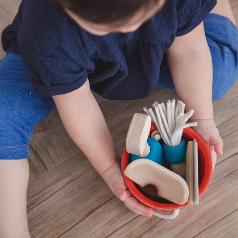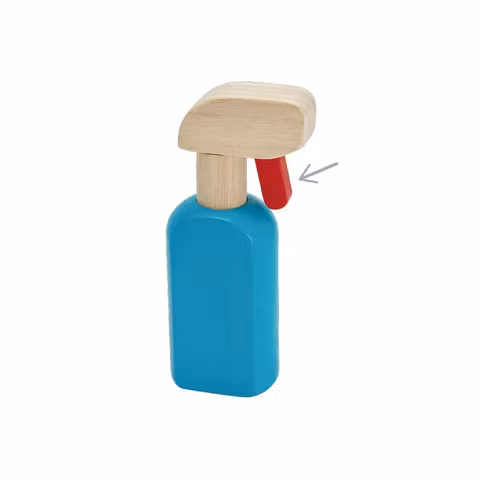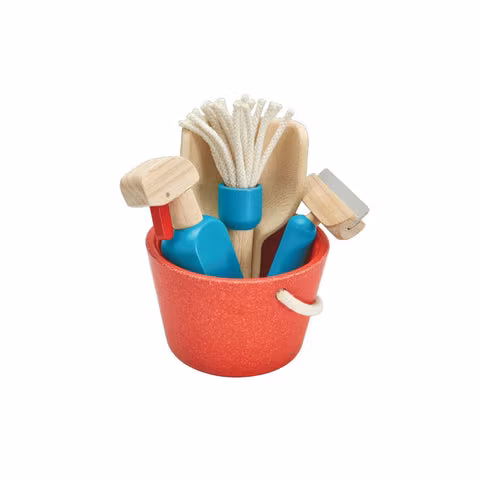 Mysigt städset med sprayflaska, kvast, skrapa, hink, och sopskyffel.Från 2 år