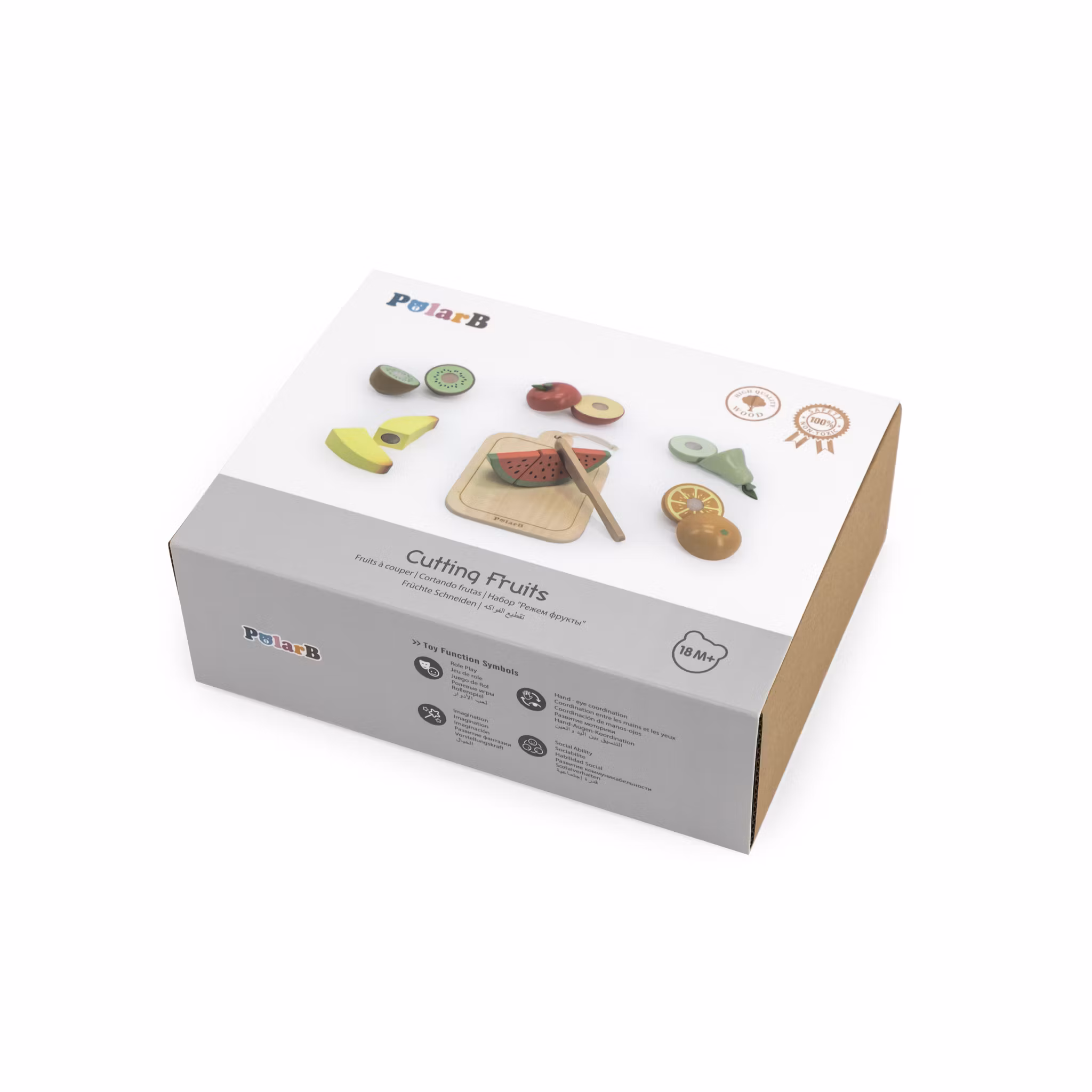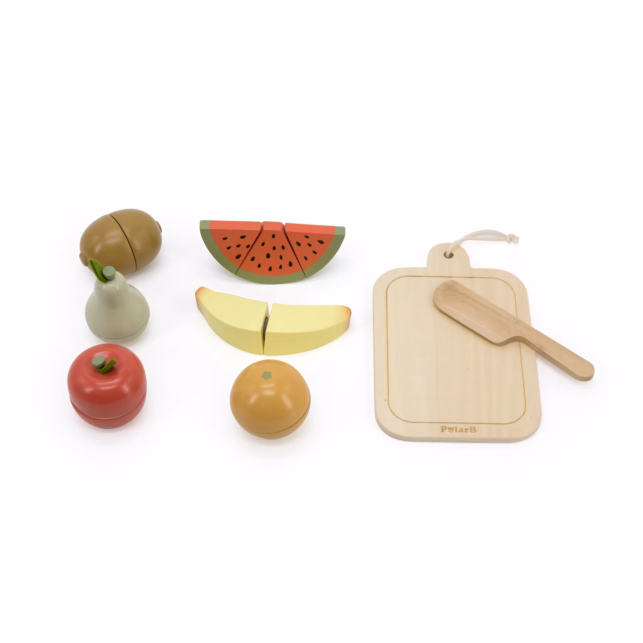Setet inkluderar en robust skärbräda och en säker, barnvänlig kniv. Frukterna som ingår är banan, melon, päron, kiwi, apelsin och äpple – alla målade i klara, tilltalande färger som fångar barnens intresse.