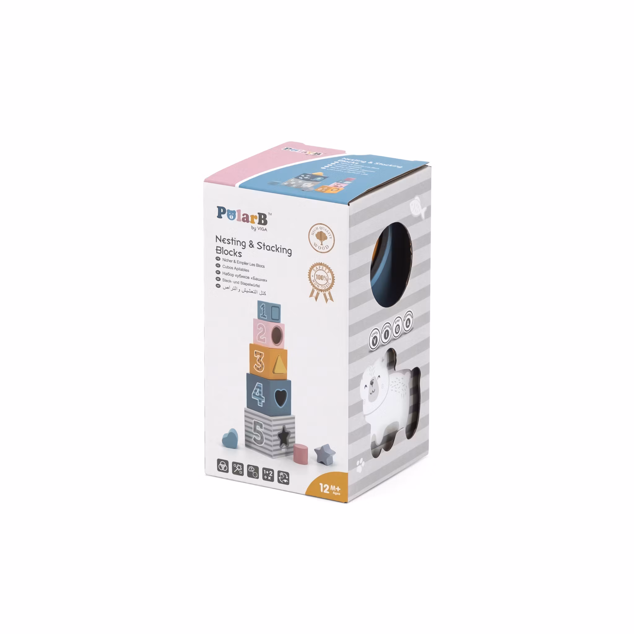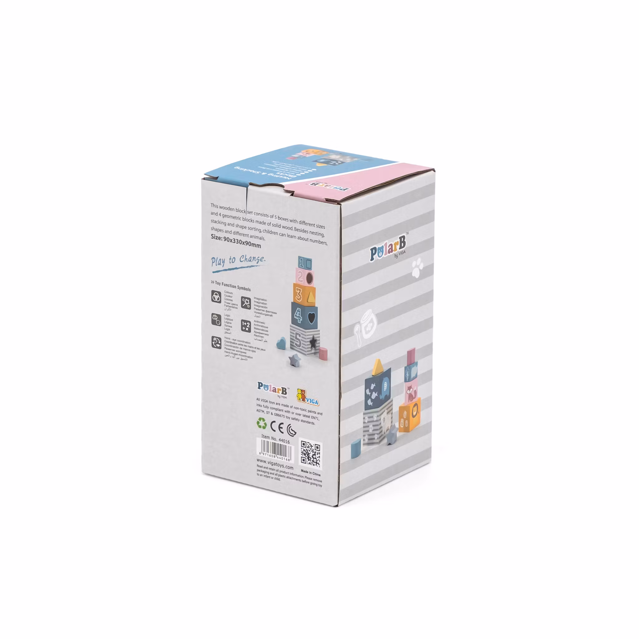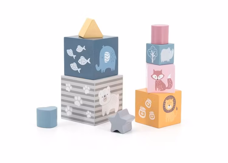 Stapelbar kub med 5 kuber. Kuben högst upp innehåller en skallra de andra 4 har hål i sig med tillhörande klossar som barnen kan lägga i.CE, REACH, EN71 1,2,39x