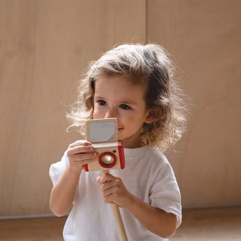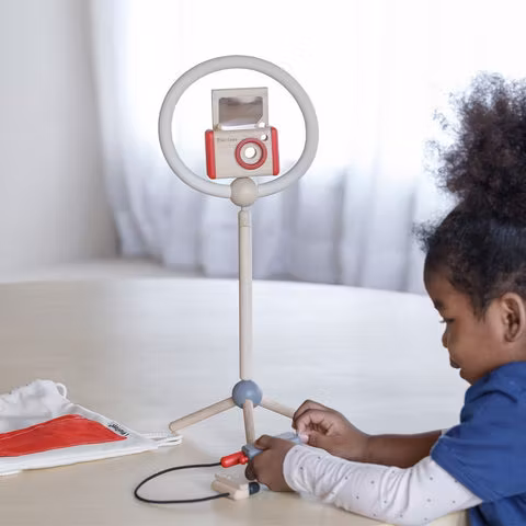 Låtsas-vlogga med detta gulliga set i trä och naturgummi.Vlogger kit kommer med en selfie stick/tri-pod, ringlampa i gummi, mikrofon, samt kamera.45 x 38 x 10 c