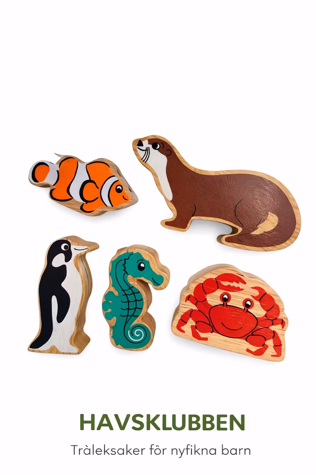 En påse med tryck och 5 roliga lekfigurer i ekologiskt odlat trä från Sri Lanka.