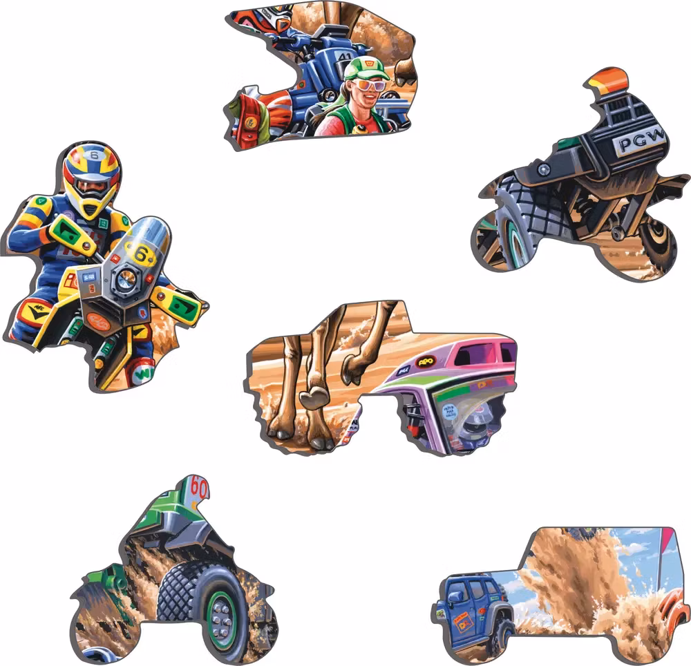 Här är ett pussel fyllt med fantastiska fordon, fart och spänning. Mellan de färgglada bilarna rider två deltagare i en kamelkapplöpning och ett par springer till fots genom öknen. En helikopter hovrar lågt över deltagarnas huvuden. Försök att föreställa dig att du är där, då skulle du höra dånet från alla motorer och bilar som snurrar i den heta sanden och kamelerna som ylar. Pusslet med 55 bitar är lämpligt för lite äldre barn. Några av pusselbitarna är formade som solglasögon, motorcyklar och bilar. Några pusselbitar är utskurna längs konturerna på bilden.