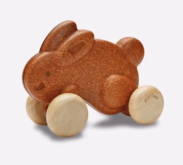 Gullig kanin i Planwood med trähjul. Mjuk design för små händer.