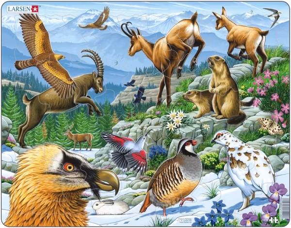 Fint pussel med livfulla färger från Larsen pussel. Pusslet på 55 bitar har motiv av alpina djur i härlig alpmiljö.
