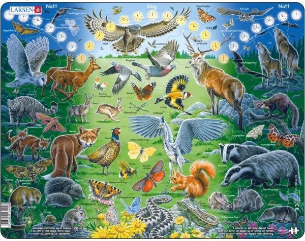 Intressant pussel på 60 bitar som visar vilka djur som är aktiva på natten och vilka som är aktiva på dagen.Motivet är en stor gräsmatta med massor av djur.