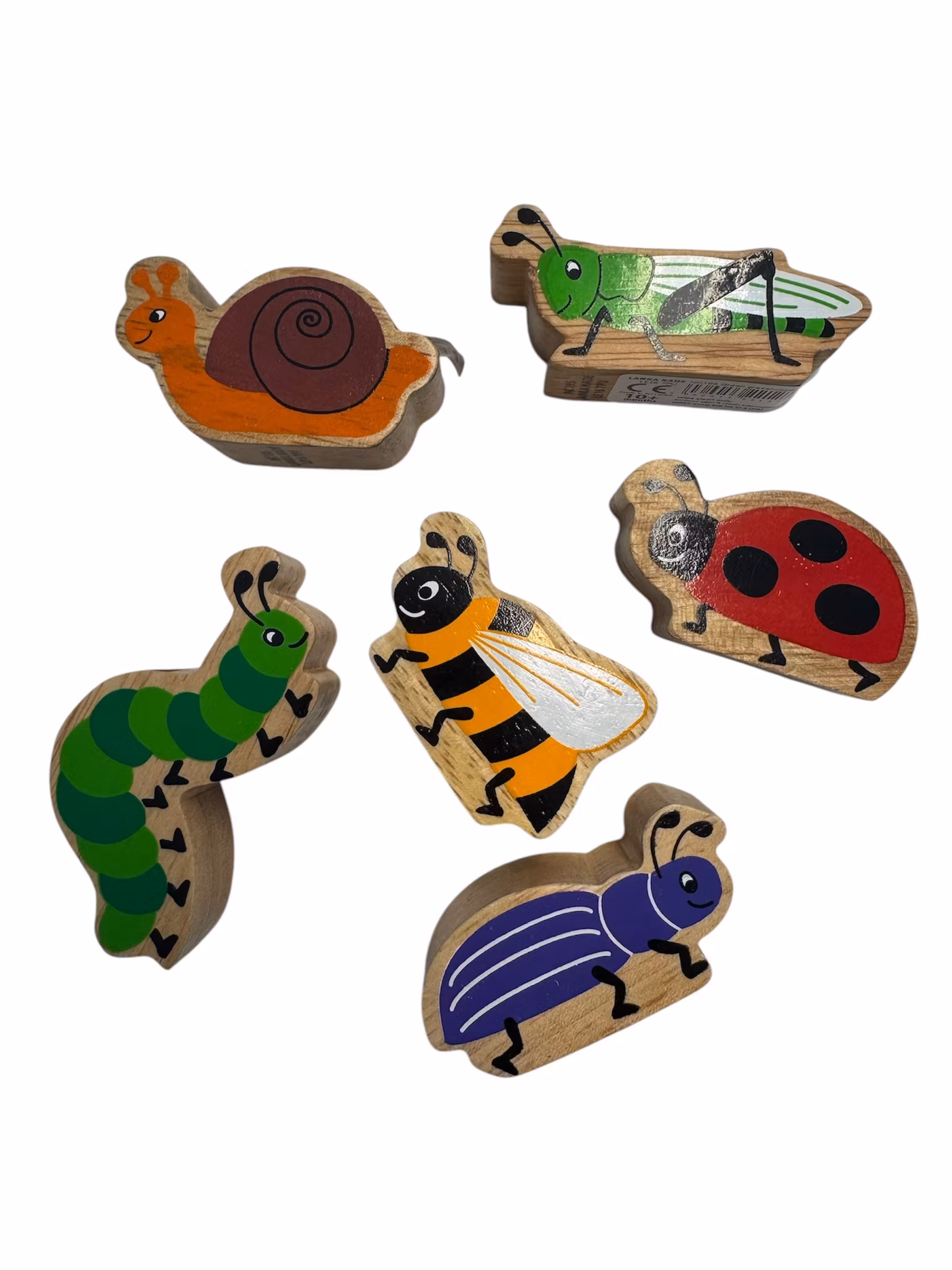 En påse med 6 roliga lekfigurer i ekologiskt odlat trä från Sri Lanka. Innehåller snigel, bi, nyckelpiga, larv, skalbagge och gräshoppa.Från fina Lanka Kad