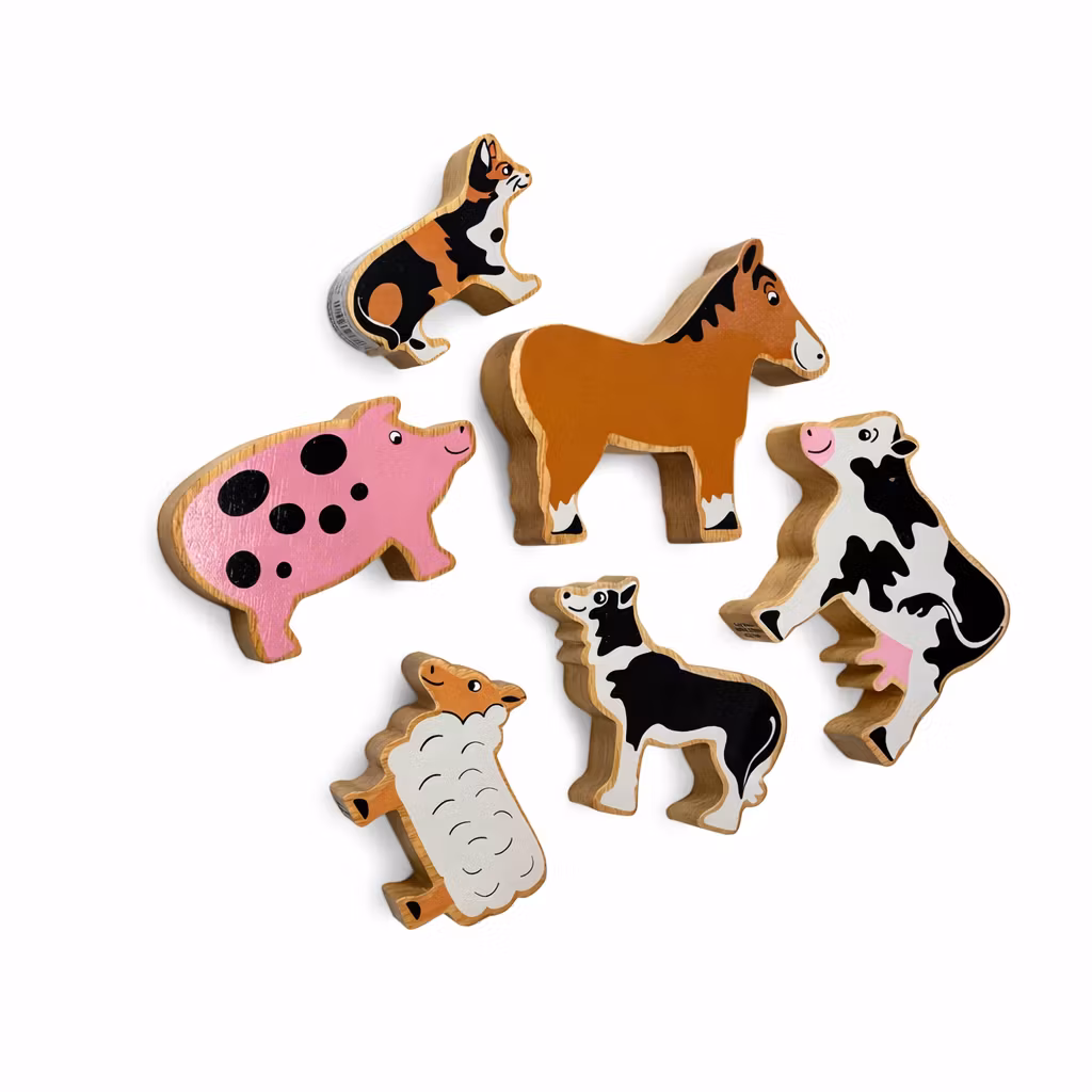 En fin bomullspåse med tryck och 6 roliga lekfigurer i ekologiskt odlat trä från Sri Lanka. Innehåller häst, gris, får, katt, hund och ko!