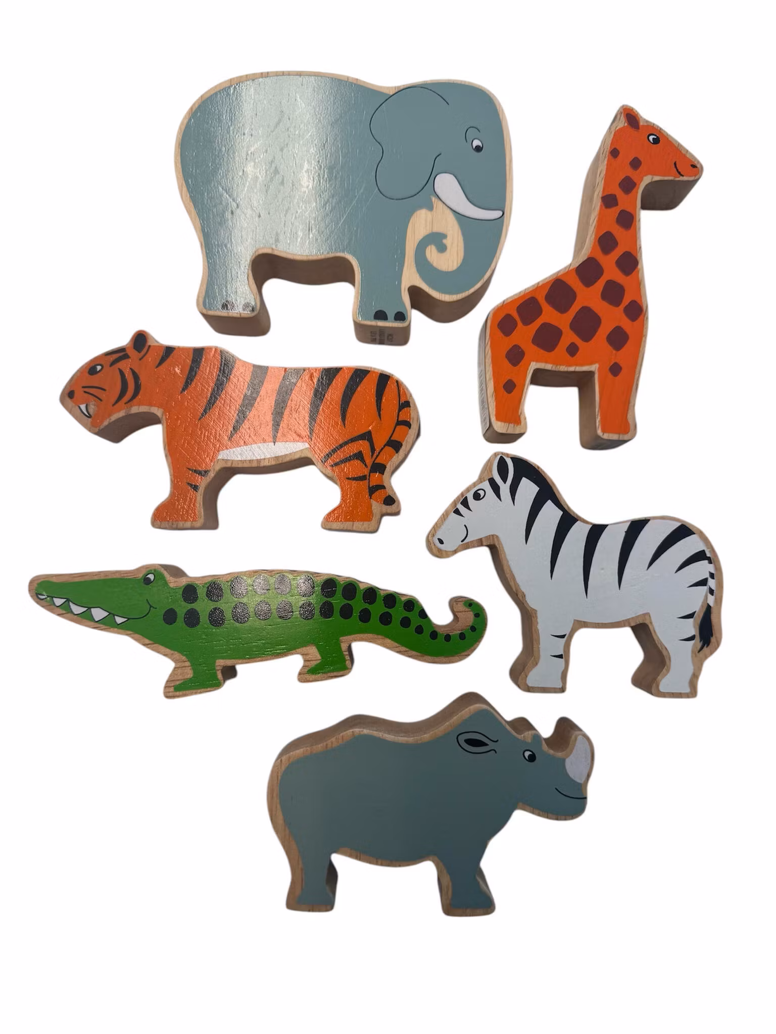 6 roliga lekfigurer i ekologiskt odlat trä från Sri Lanka.