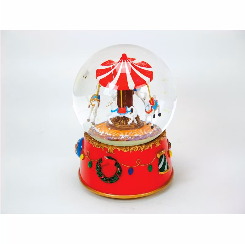 Snöglob med karusell. Karusellen och dess hästar roterar inuti globen medan en julmelodi spelas. Mått: 12,5 x 12,5 x 16,5 cmEj en leksak.SPECIALBESTÄLLNING, LEV