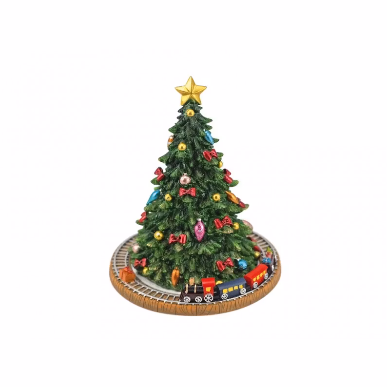 Julgran med tåg. Tåget roterar runt granen medan melodin "O Christmas Tree" spelas. Mått: Ø15x18,5 cm.Ej en leksak.SPECIALBESTÄLLNING, LEVERANS I NOVEMBER!