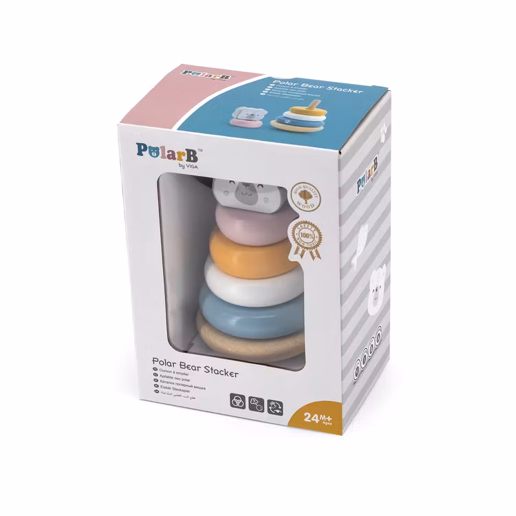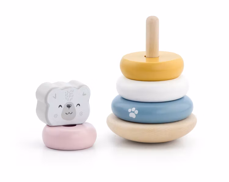 Stapelklossar torn från VIGA som barnen älskar! Nu måste man prova alla sätt att få på klossarna så att björnen blir nöjd med sin form.