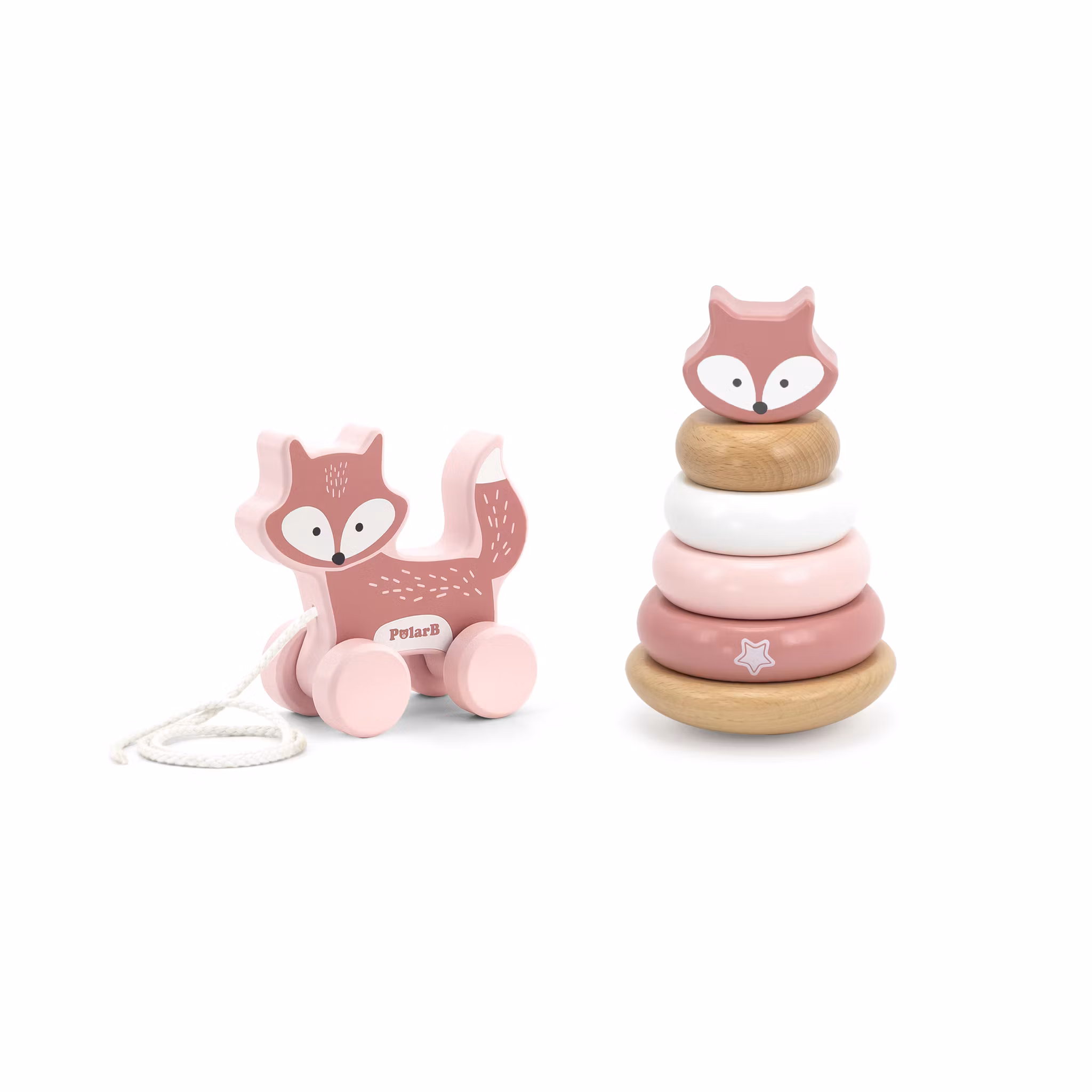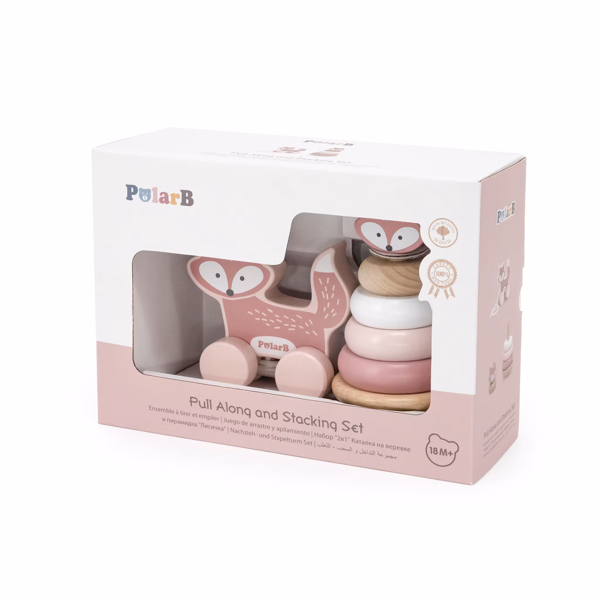 Här kommer ett färdigt matchande presentkitt i fin låda! Stapeltorn och dragleksak, de två roligaste första leksakerna för babyn.