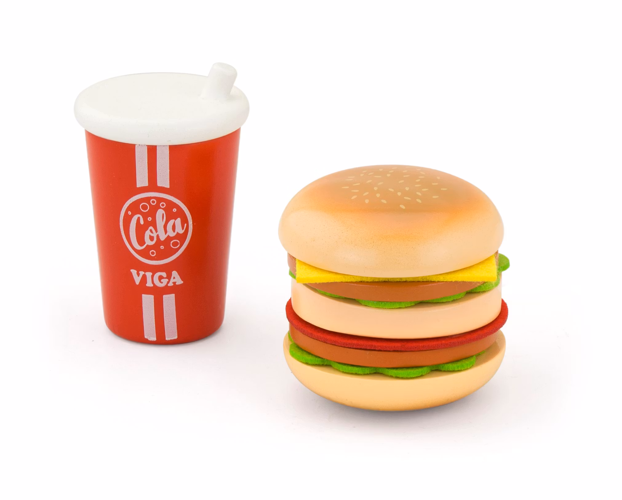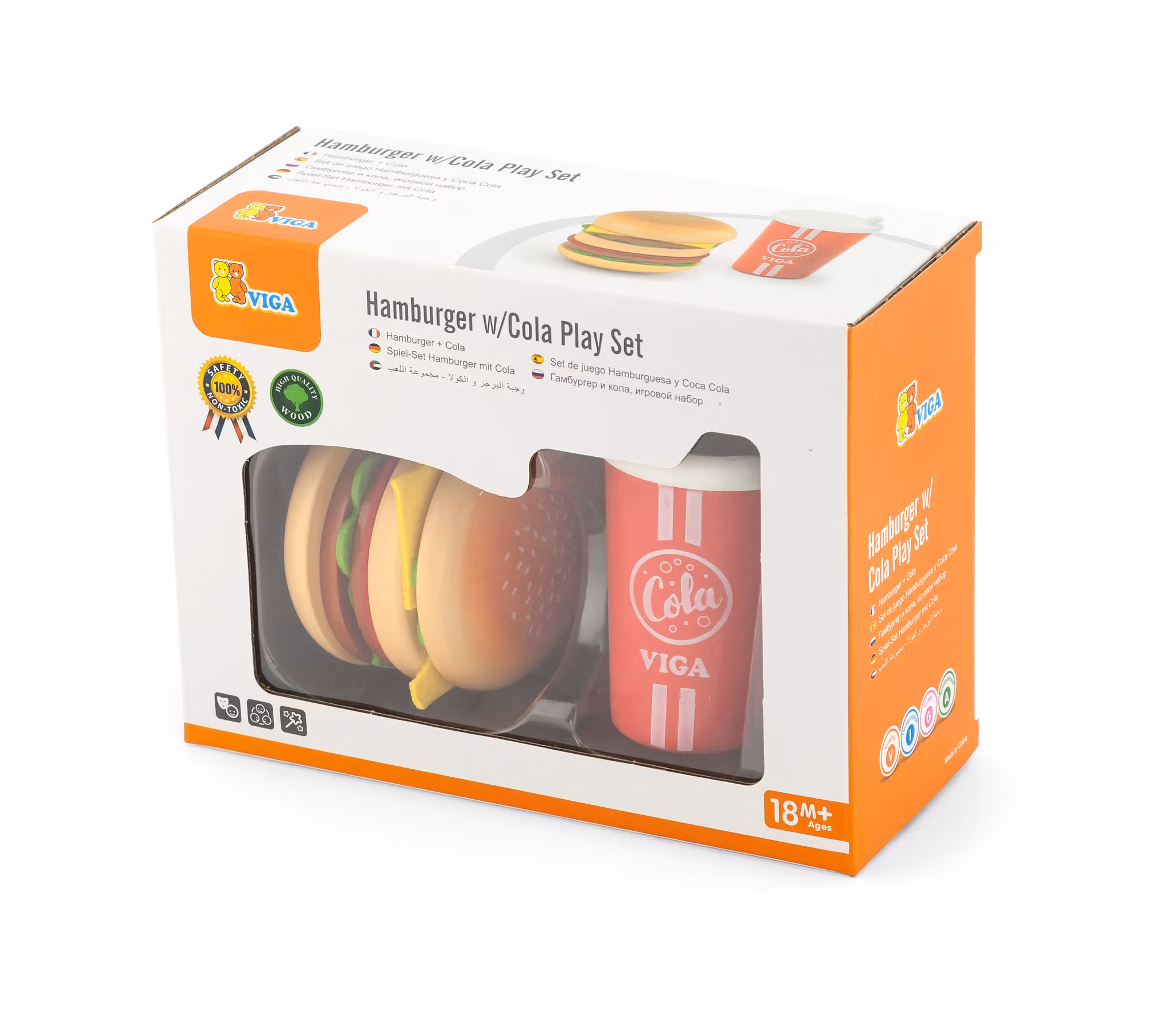 Hamburgare och Cola från VIGA kan man skapa goda maträtter med. Leksaksmaten är stilistiskt utformad med många verklighetstrogna detaljer. Ett lekset som främja