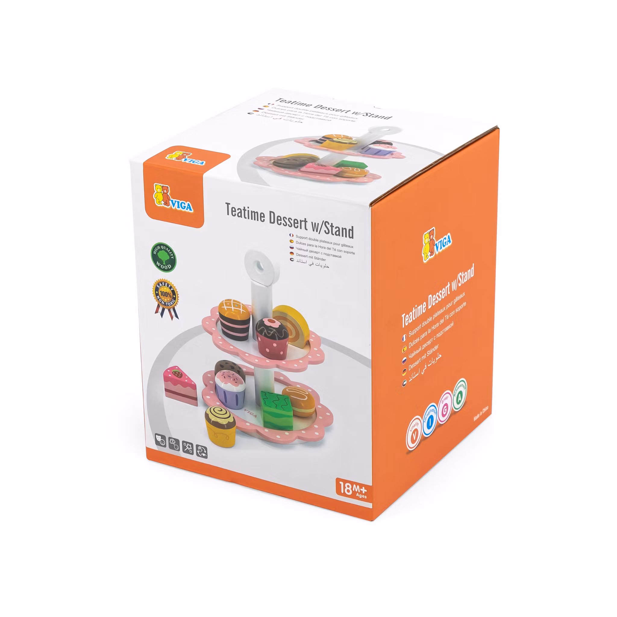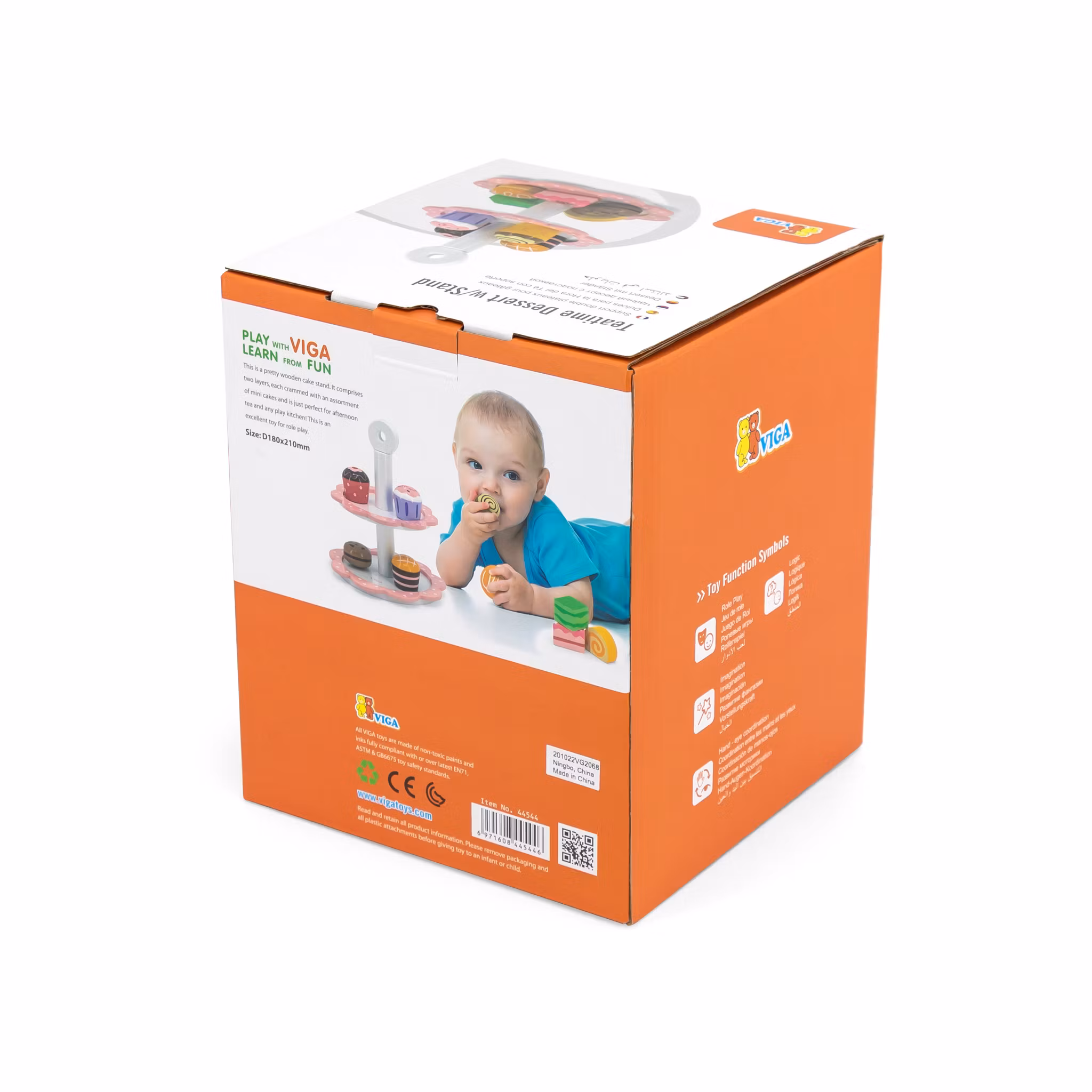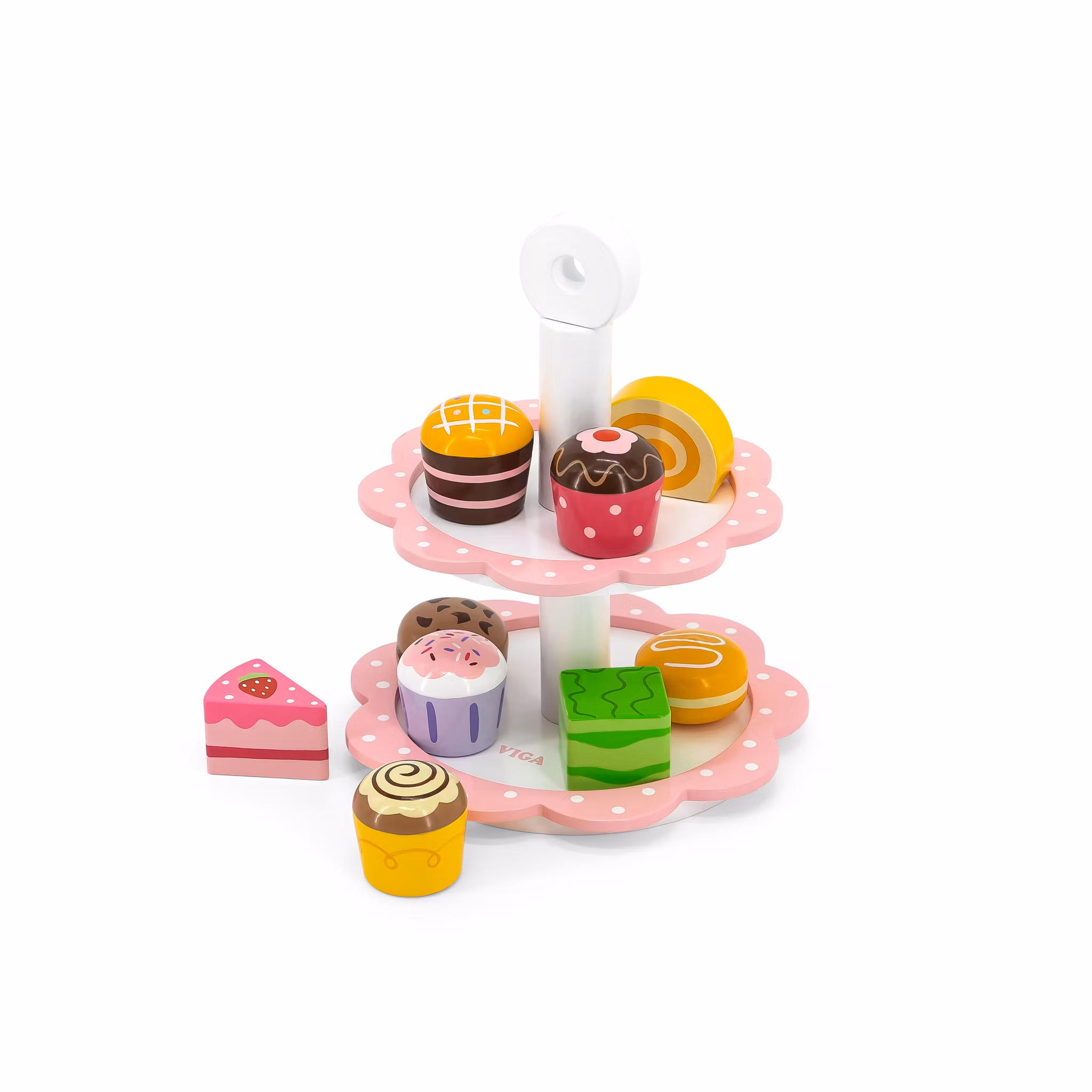 Cup Cake från VIGA får du ett fint fat med två hyllor, goda cupcakes och olika bakelser. Bjud över familj och vänner på kalas med det här cupcake-fatet