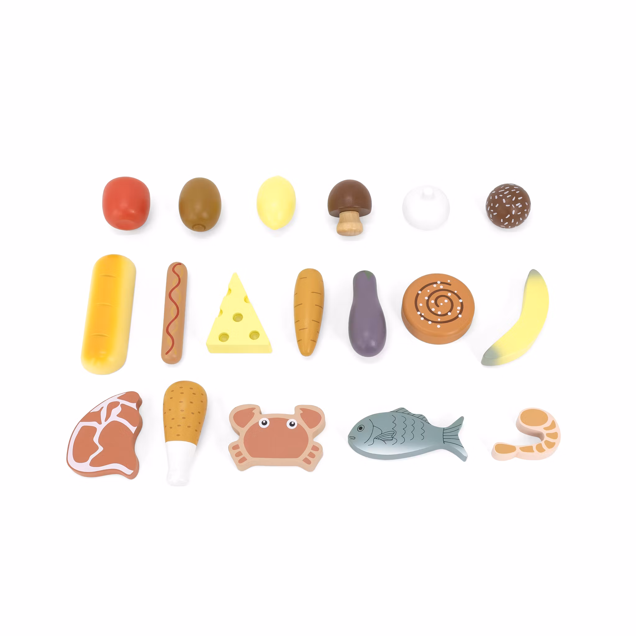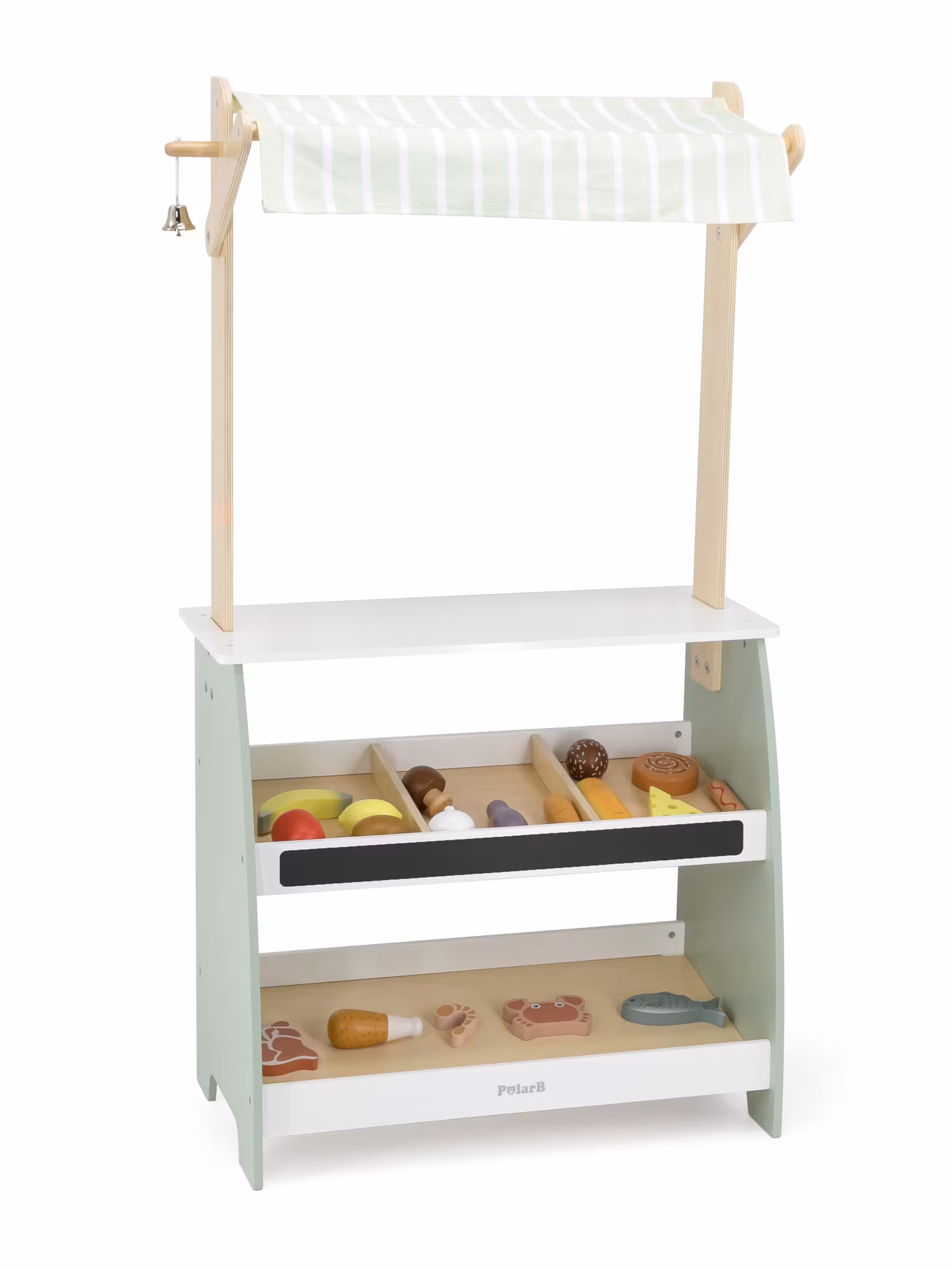 Härligt marknadsstånd från Viga med en behaglig och lockande design, perfekt för små knallar! Marknadsståndet kommer med 23 olika livsmedel - en färgsprakande mångfald av frukt, grönsaker, kött och fisk, samt en liten griffeltavla som kan användas för att märka upp priser eller välkomna kunder. Med en tillhörande ringklocka kan man enkelt fånga kundernas uppmärksamhet.