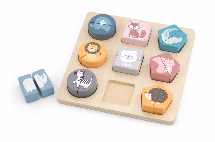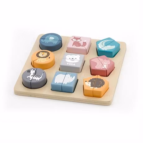 Färgglatt träpusslet från VIGA som lär våra barn former, djur och motorik. Fyll figurerna med två pusselbitar för var djur.