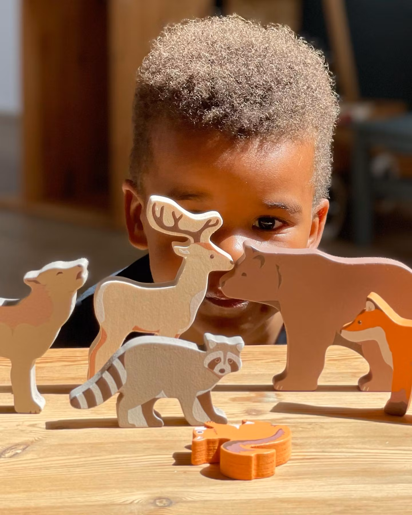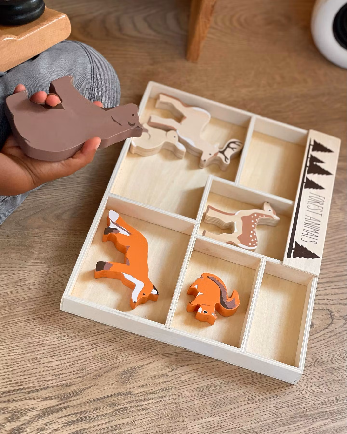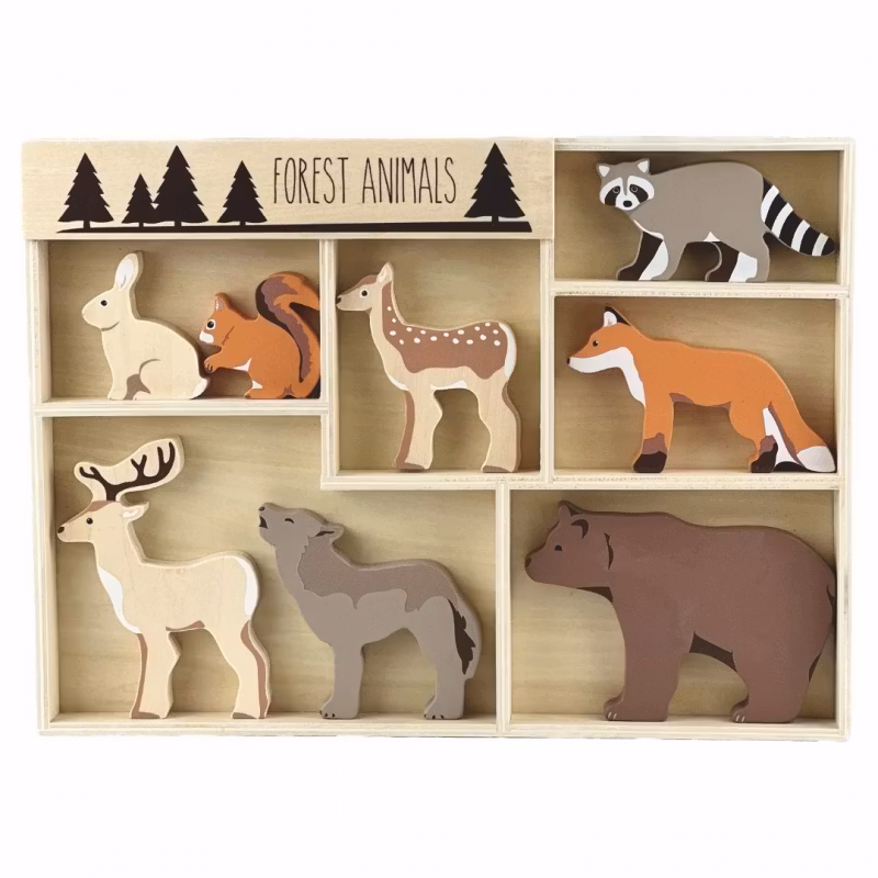 Traditionella och älskade skogsdjur, var och en tillverkad av hållbart trä. 1 av varje djur i en vacker och dekorativ förvaringslåda: Kanin, ekorre, rådjur, räv