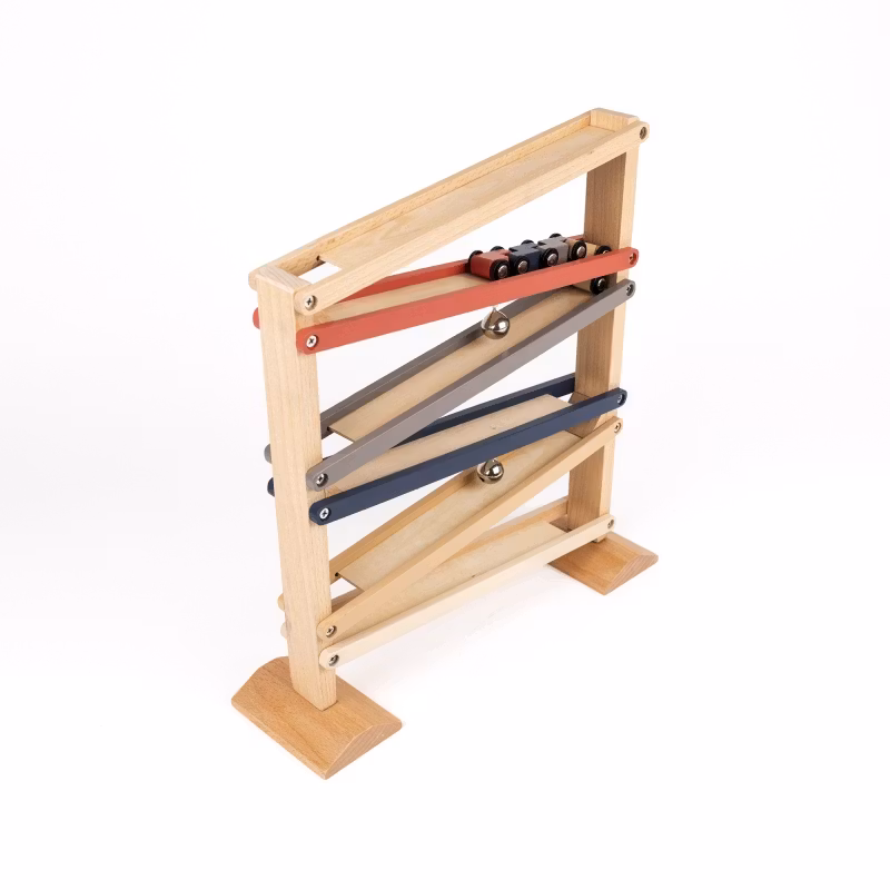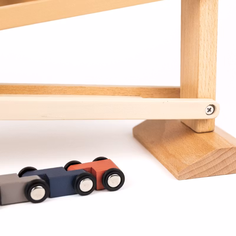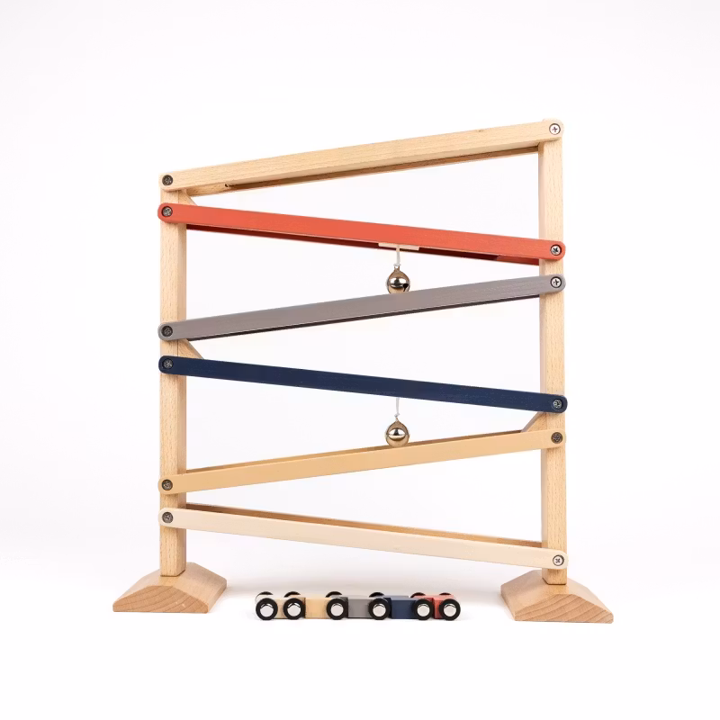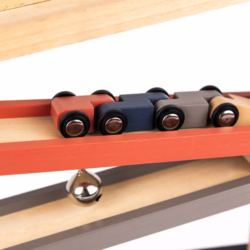 Klara, färdiga, kör! Se de små träbilarna susa nerför de färgglada ramperna, en nivå i taget, och ringa en glad klocka längs vägen.