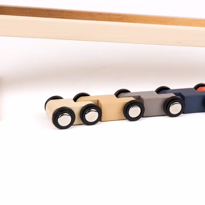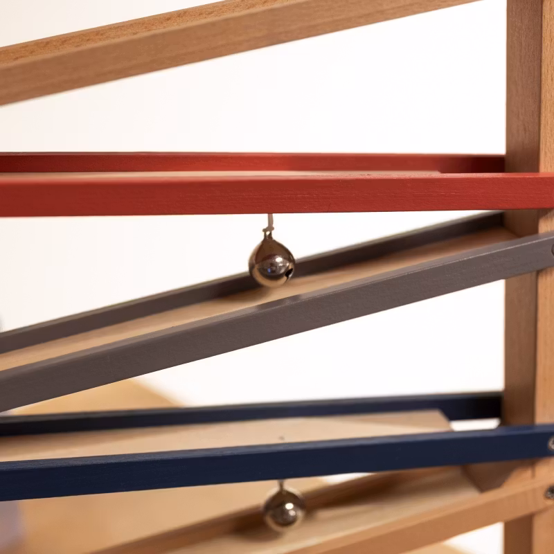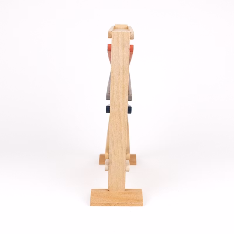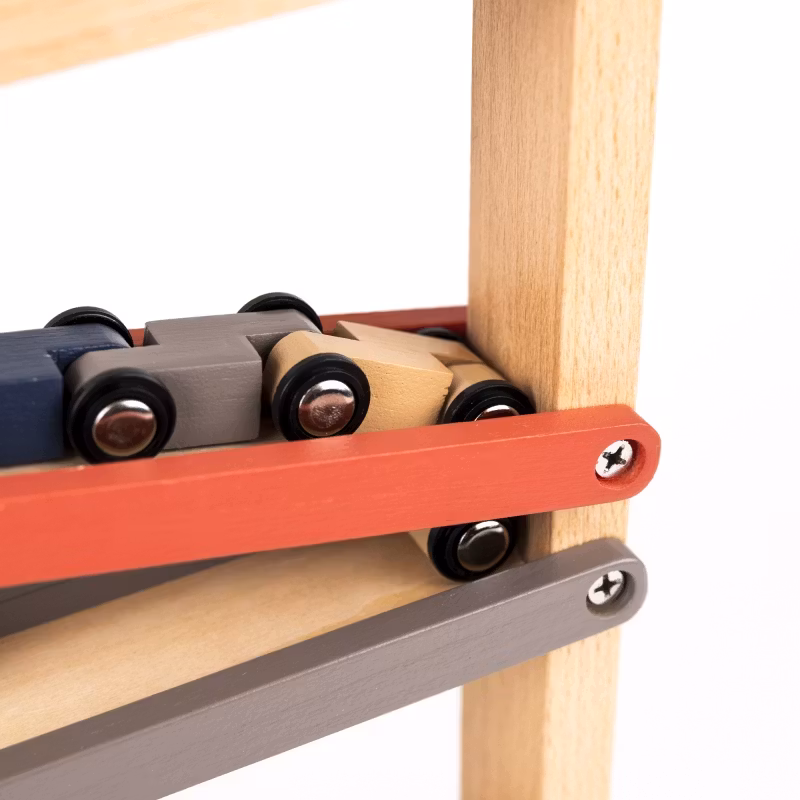 Klara, färdiga, kör! Se de små träbilarna susa nerför de färgglada ramperna, en nivå i taget, och ringa en glad klocka längs vägen. Denna klassiska trärutschkana är perfekt för nyfikna småbarn och hjälper till att utveckla hand-öga-koordination, visuell spårning och en känsla för orsak och verkan. Med sin träram och eleganta design är det en tidlös leksak som ger glädje till både lek och inredning. Innehåller fyra bilar i mjuka retrofärger.