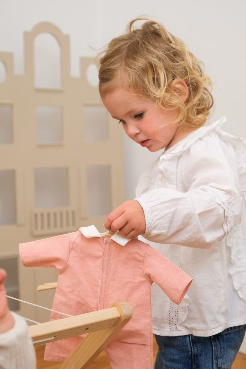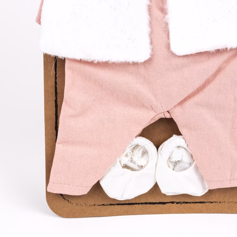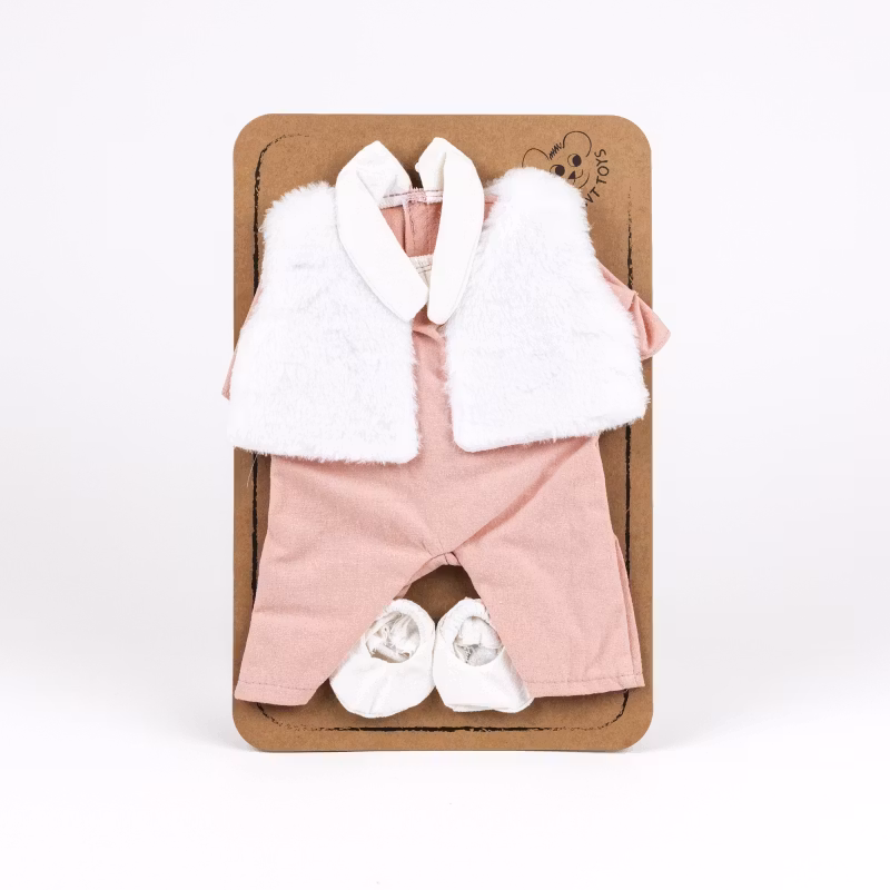 Detta fina klädset från Egmont toys passar dockor 30-34cm. Rosa overall med vit krage, mjuk vit väst och små tossor för att hålla dockans fötter varma.