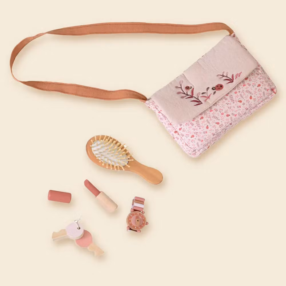 Denna mjuka väska från Egmont toys innehåller olika prylar för dagens äventyr! Broste, klocka, läppstift och nycklar.