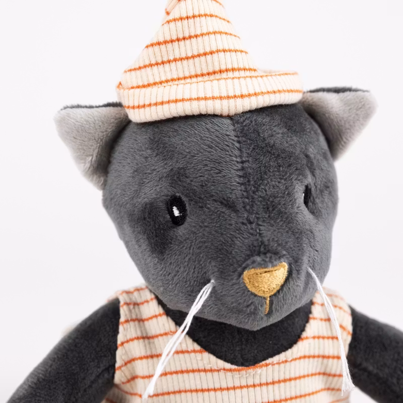 Härliga katten Malo tillhör vännerfamiljen från Egmont toys. Malo är klädd i randig pyjamas och matchande hatt, en mjuk och go kompis perfekt för små armar.
