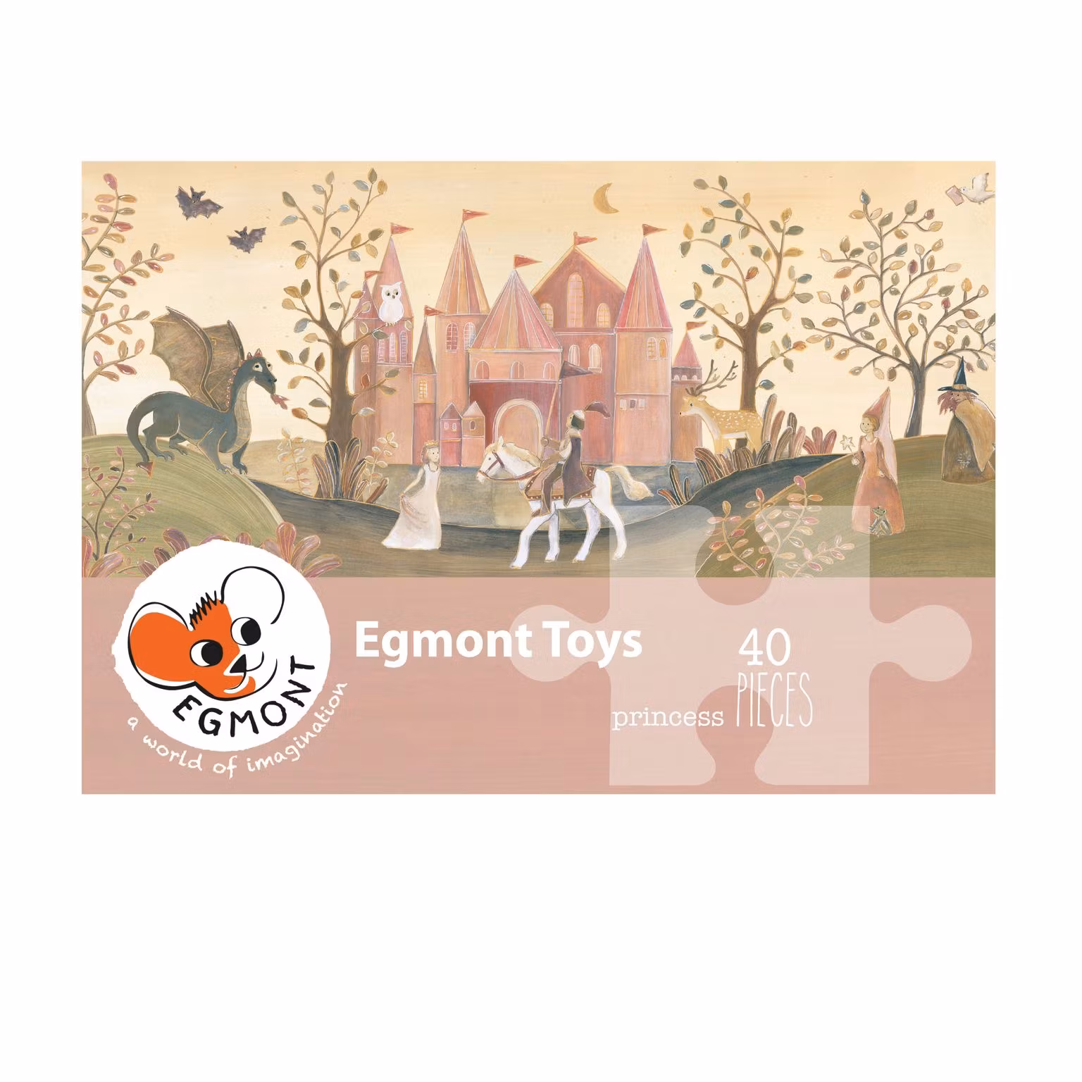 Stort fint pussel med medeltida motiv! 40-bitars pussel med prinsessa, riddare, feer och drake. Målat i pastellfärger.