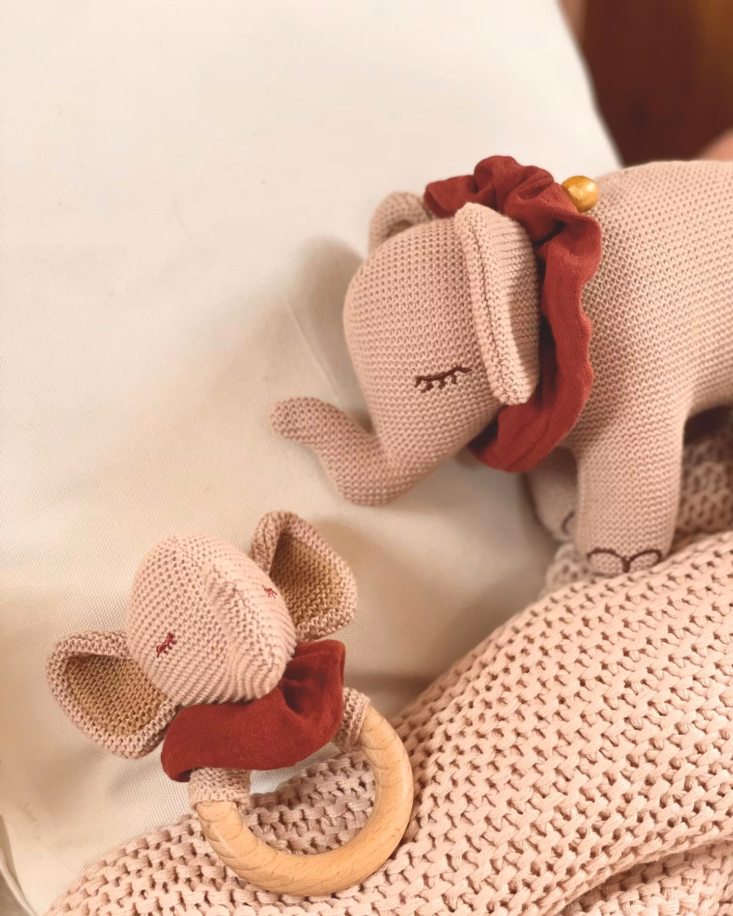 Elefanten Rosalie från Egmont toys är den musikaliska speldosan i stickad bomull. Dra i den lilla guldbollen och lyssna på den härliga musiken.
