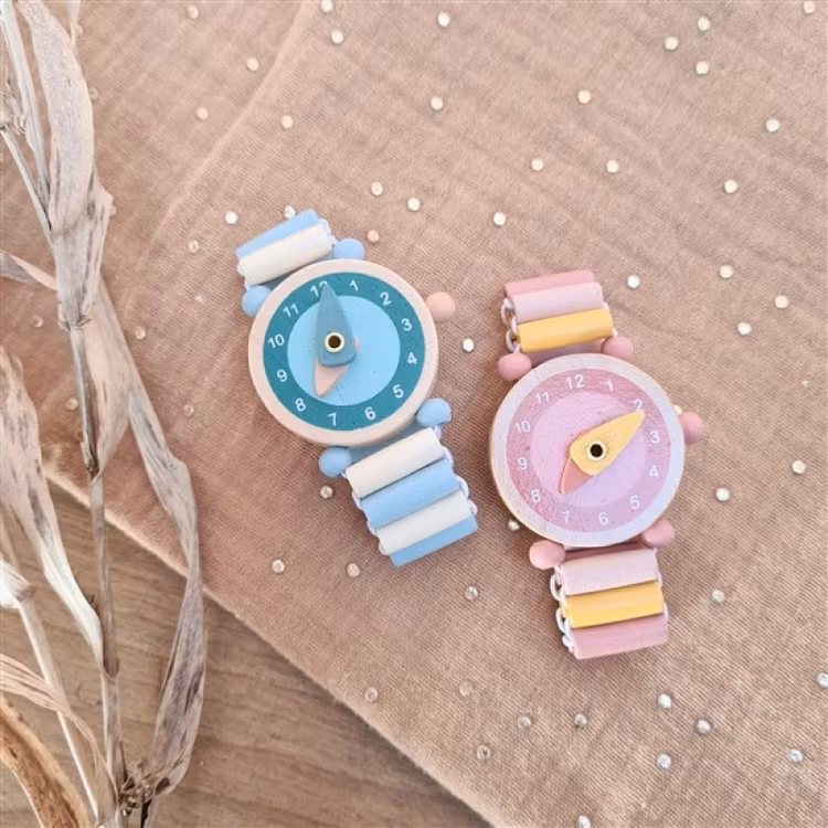 Dags att lära sig klockan med denna fina barnklocka i trä! Trevlig träklocka för barn med rörliga visare för att lära sig tiden. Mjuk och skön att ha runt handl