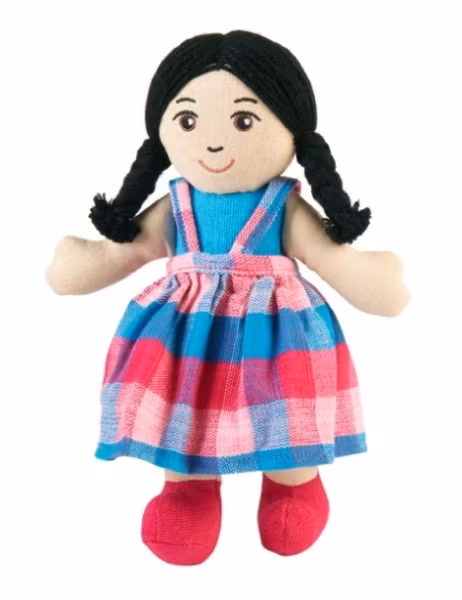 En liten flicka docka med mörkt hår och avtagbar pinafore klänning. Varje docka är unik, handgjord av vackert handvävt tyg. Super gosig och redo för speltid!