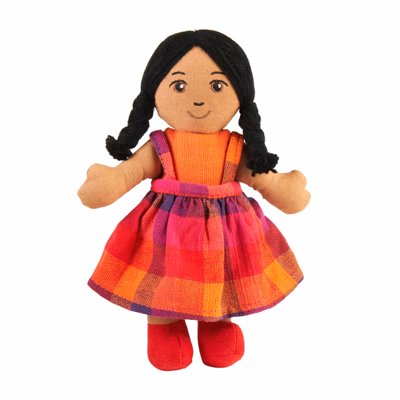 Denna lilla dockan har brun hud, svart hår och färgglad klänning. Reflekterande av den mångkulturella världen vi lever i, är denna docka idealisk för kramar, ro
