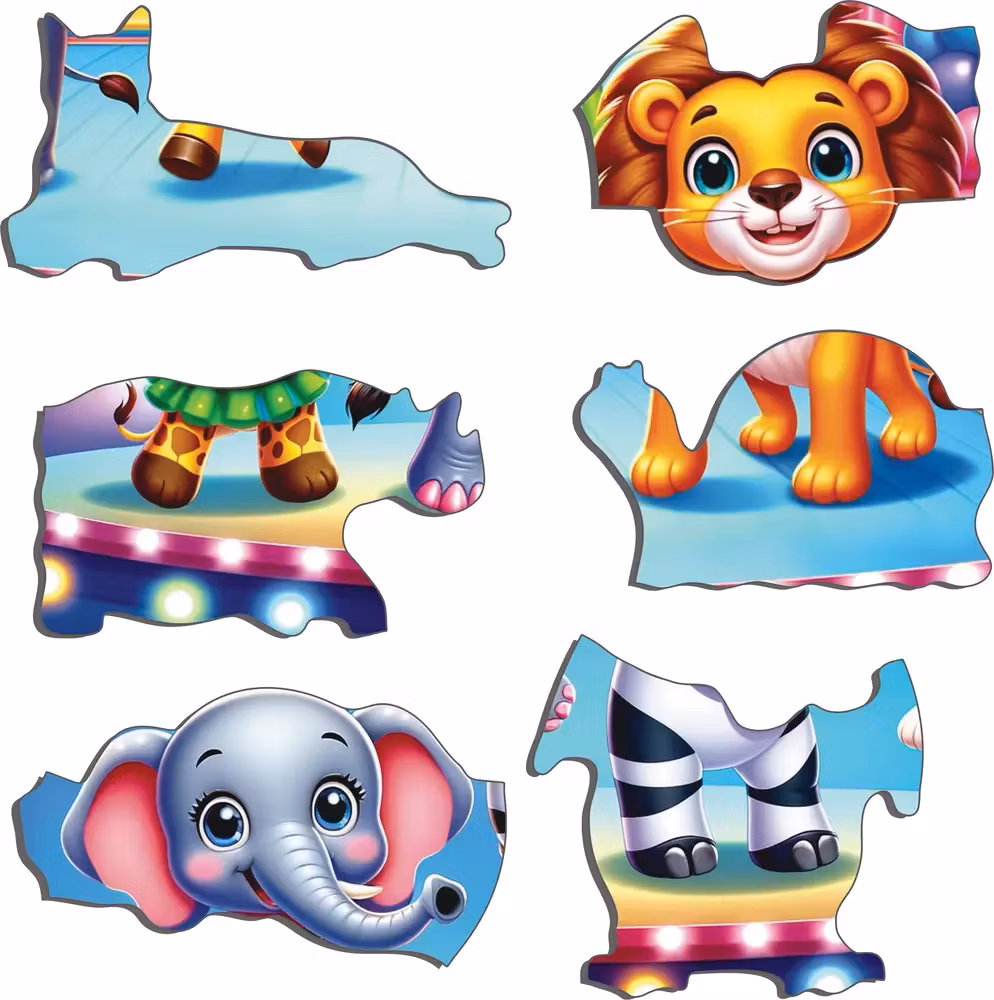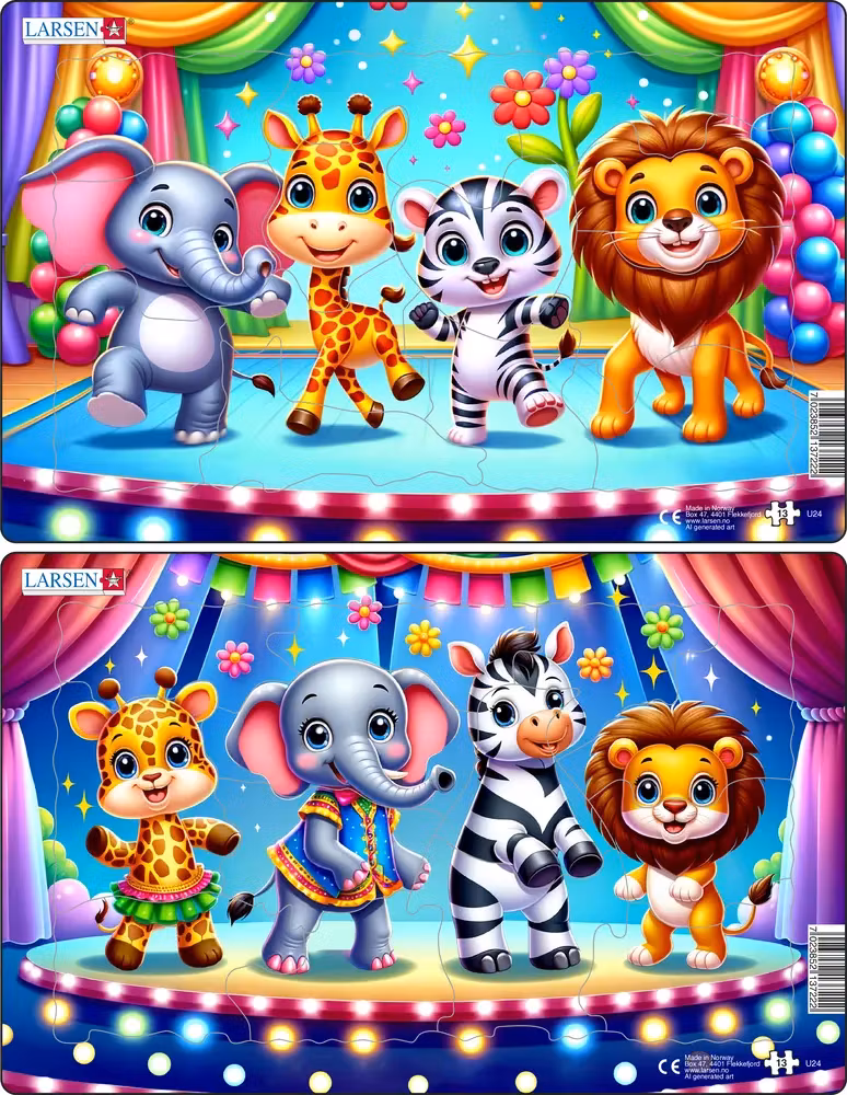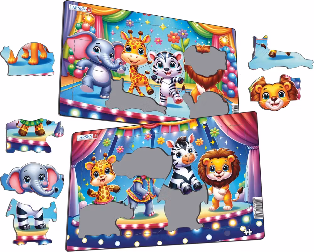Giraffen Maria, elefanten Noa, zebran Emma och lejonet Alexander dansar på teaterscenen. Showen har precis börjat och nu är de lite nervösa, men de ler och hoppas att allt ska gå bra. Varje pussel har 13 stora pusselbitar som är bra att hålla i små händer. En del av de skräddarsydda pusselbitarna är formade som figurer som barnen kommer att känna igen. Set med 2 pussel.