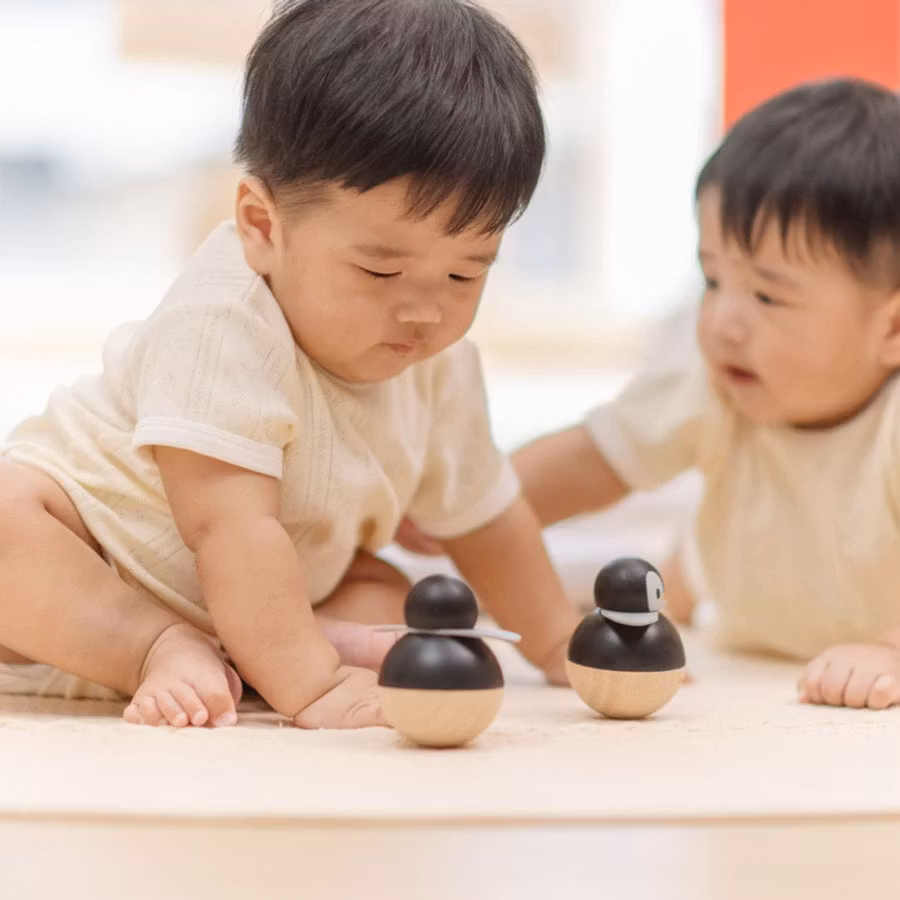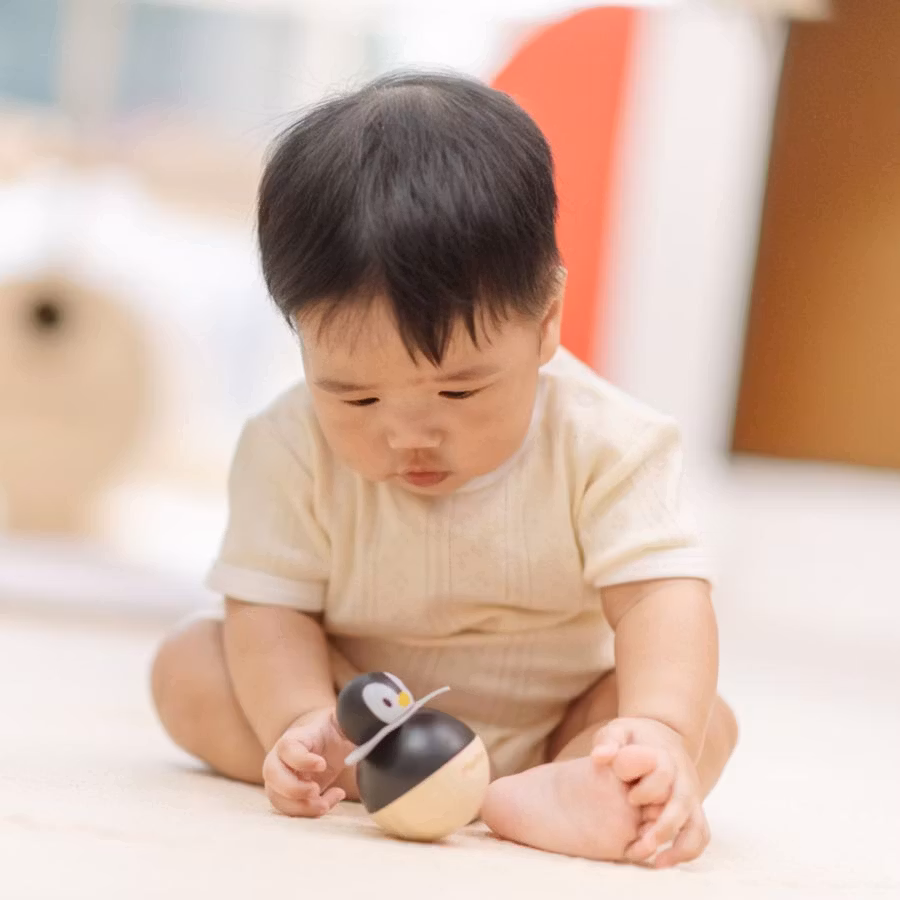 Omfamna pingvinens wobbling genom lek! Pingvinwobblern engagerar spädbarn från födseln och stimulerar visuell spårning, sträckning och rörelse. Nyfödda fokuserar på dess rörelse, medan maglektion stärker nack- och bålmusklerna. Vid 3–5 månader sträcker sig bebisarna efter den, vilket förfinar hand-öga-koordinationen, och vid 5–6 månader knuffar de den själva, lär sig orsak och verkan samtidigt som de bygger motoriska färdigheter för krypning och vidare.