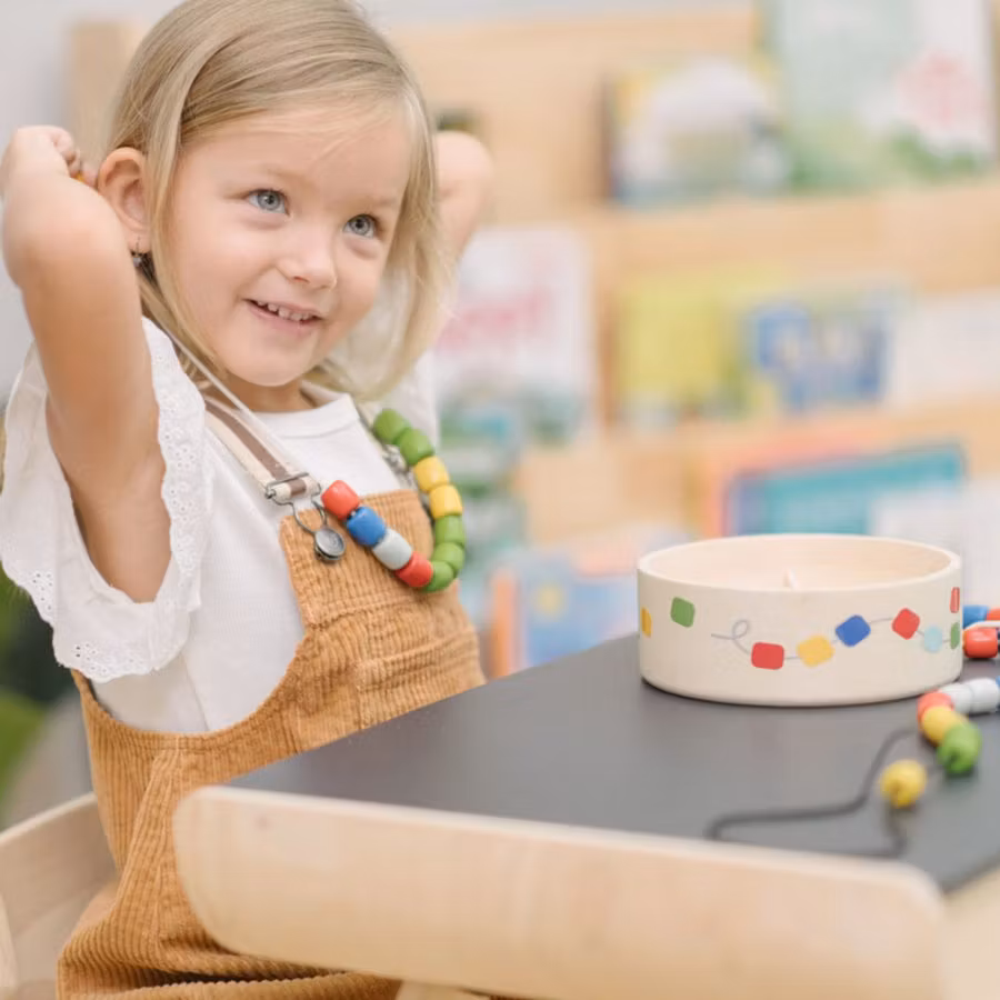 Visuellt tillfredsställande och taktil, uppmuntrar denna aktivitet barn att trä färgglada träpärlor, vilket förfinar finmotorik, hand-öga-koordination och handledskontroll – viktiga grunder för skrivning, penngrepp och egenvårdsuppgifter. När de noggrant trär varje pärla utvecklar barnen koncentration, uthållighet och kreativitet samtidigt som de förstärker logiskt tänkande, planering och sekvenseringsförmåga. Denna engagerande aktivitet stöder också färgigenkänning och mönsterbildning. Den fungerar även som en förvaringslåda för enkel organisering. Setet innehåller: 3 snören, 60 pärlor (12 av varje i gult, mörkblått, ljusblått, grönt och rött).