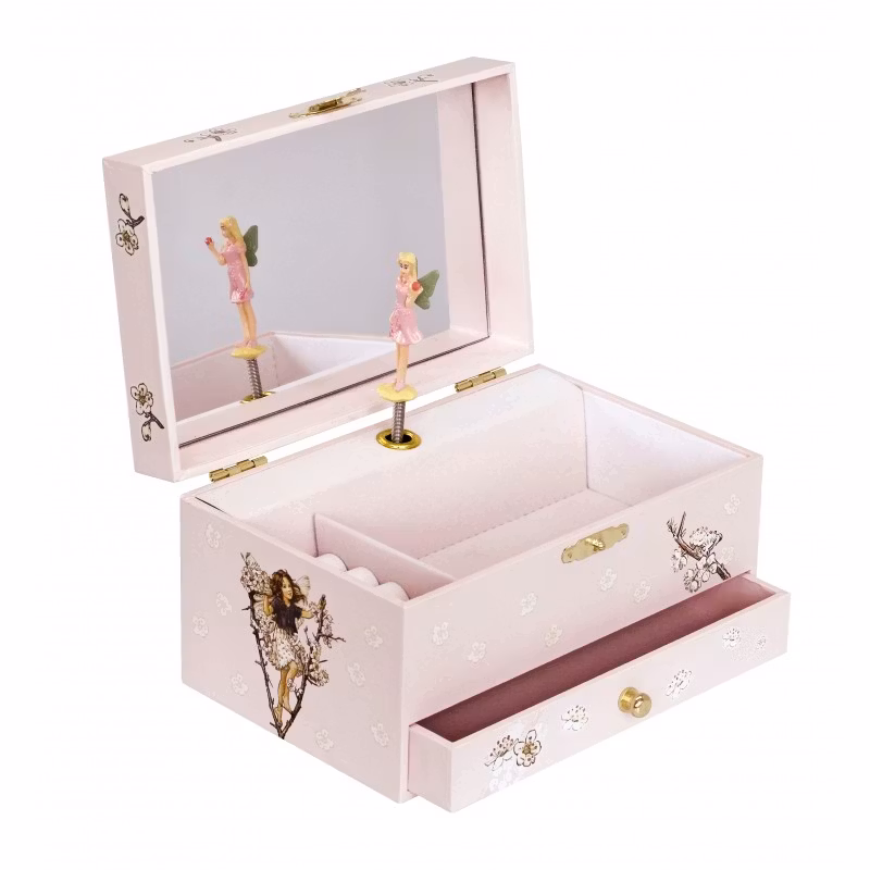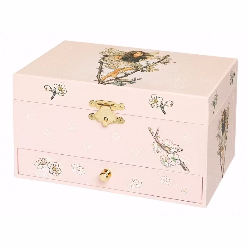 Supersött smyckeskrin i en mjuk rosa färg med den urgulliga älvan som klättrar bland blommorna. Älvan dansar när skrinet spelar en vaggvisan inspirerad av Schubert's "Serenade" efter att man skruvat upp det med nyckeln och lyft på locket.